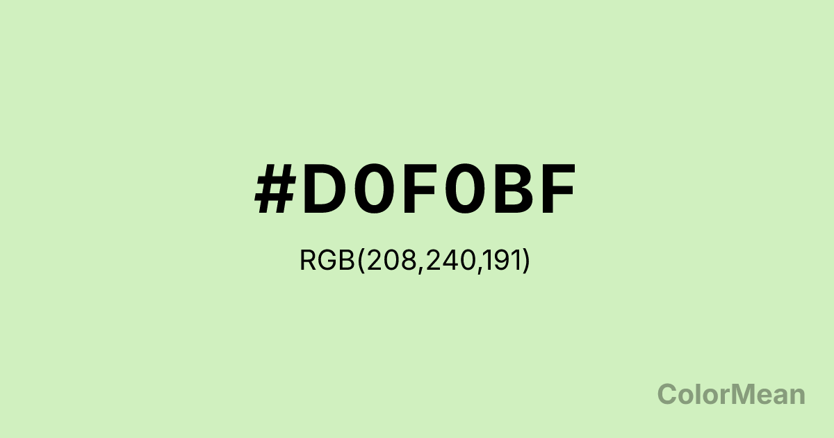 #D0F0BF RGB value is (208, 240, 191). The hex color red value is 208, green is 240, and blue is 191. Its HSL format shows a hue of 99°, saturation of 62 percent, and lightness of 85 percent. The CMYK process values are 13 percent, 0 percent, 20 percent, 6 percent.