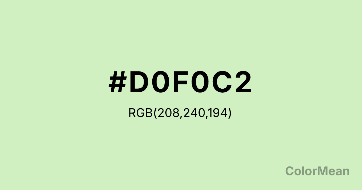 #D0F0C2 RGB value is (208, 240, 194). The hex color red value is 208, green is 240, and blue is 194. Its HSL format shows a hue of 102°, saturation of 61 percent, and lightness of 85 percent. The CMYK process values are 13 percent, 0 percent, 19 percent, 6 percent.