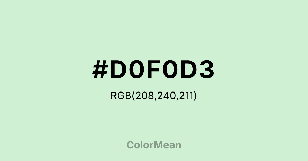#D0F0D3 RGB value is (208, 240, 211). The hex color red value is 208, green is 240, and blue is 211. Its HSL format shows a hue of 126°, saturation of 52 percent, and lightness of 88 percent. The CMYK process values are 13 percent, 0 percent, 12 percent, 6 percent.
