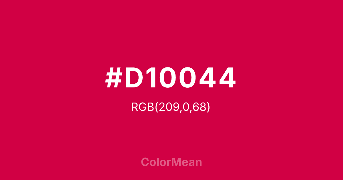 #D10044 RGB value is (209, 0, 68). The hex color red value is 209, green is 0, and blue is 68. Its HSL format shows a hue of 340°, saturation of 100 percent, and lightness of 41 percent. The CMYK process values are 0 percent, 100 percent, 67 percent, 18 percent.