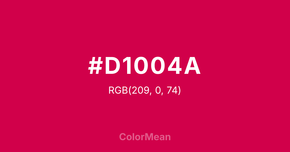 #D1004A RGB value is (209, 0, 74). The hex color red value is 209, green is 0, and blue is 74. Its HSL format shows a hue of 339°, saturation of 100 percent, and lightness of 41 percent. The CMYK process values are 0 percent, 100 percent, 65 percent, 18 percent.