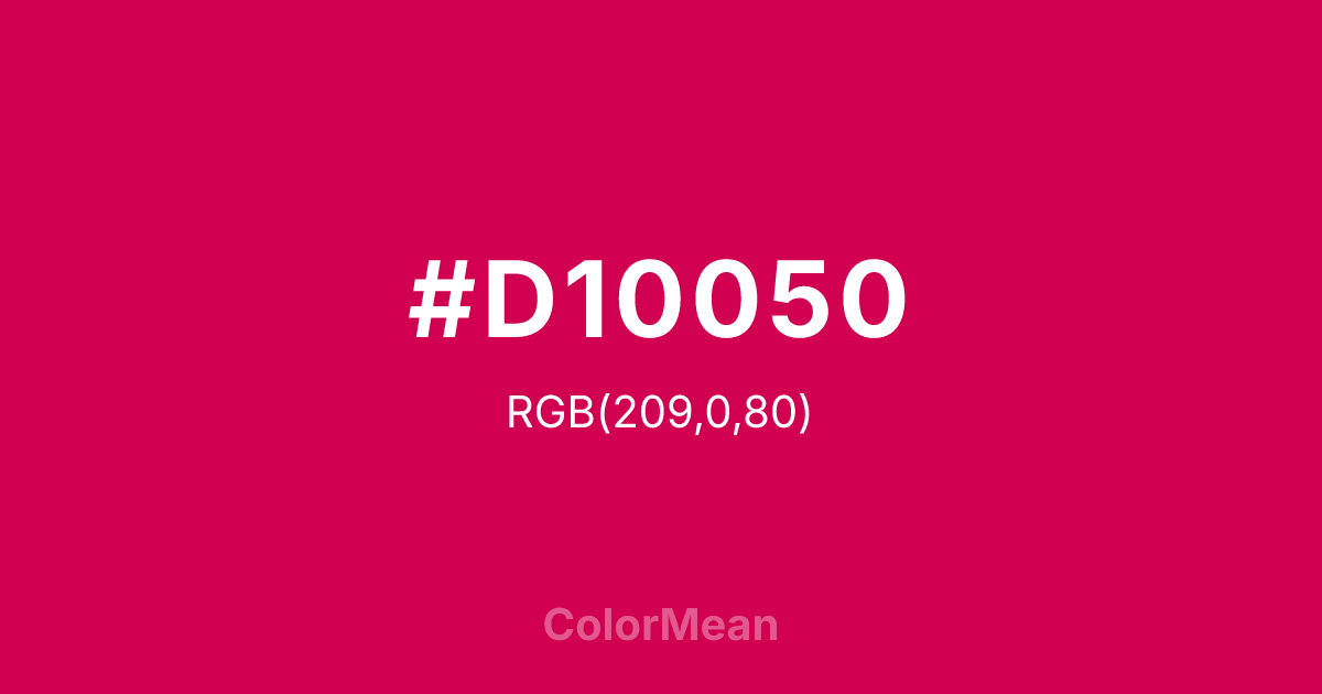 #D10050 RGB value is (209, 0, 80). The hex color red value is 209, green is 0, and blue is 80. Its HSL format shows a hue of 337°, saturation of 100 percent, and lightness of 41 percent. The CMYK process values are 0 percent, 100 percent, 62 percent, 18 percent.