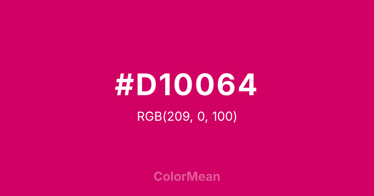 #D10064 RGB value is (209, 0, 100). The hex color red value is 209, green is 0, and blue is 100. Its HSL format shows a hue of 331°, saturation of 100 percent, and lightness of 41 percent. The CMYK process values are 0 percent, 100 percent, 52 percent, 18 percent.