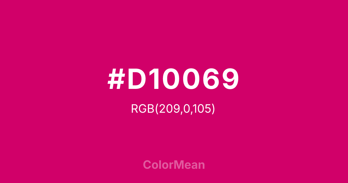 #D10069 RGB value is (209, 0, 105). The hex color red value is 209, green is 0, and blue is 105. Its HSL format shows a hue of 330°, saturation of 100 percent, and lightness of 41 percent. The CMYK process values are 0 percent, 100 percent, 50 percent, 18 percent.