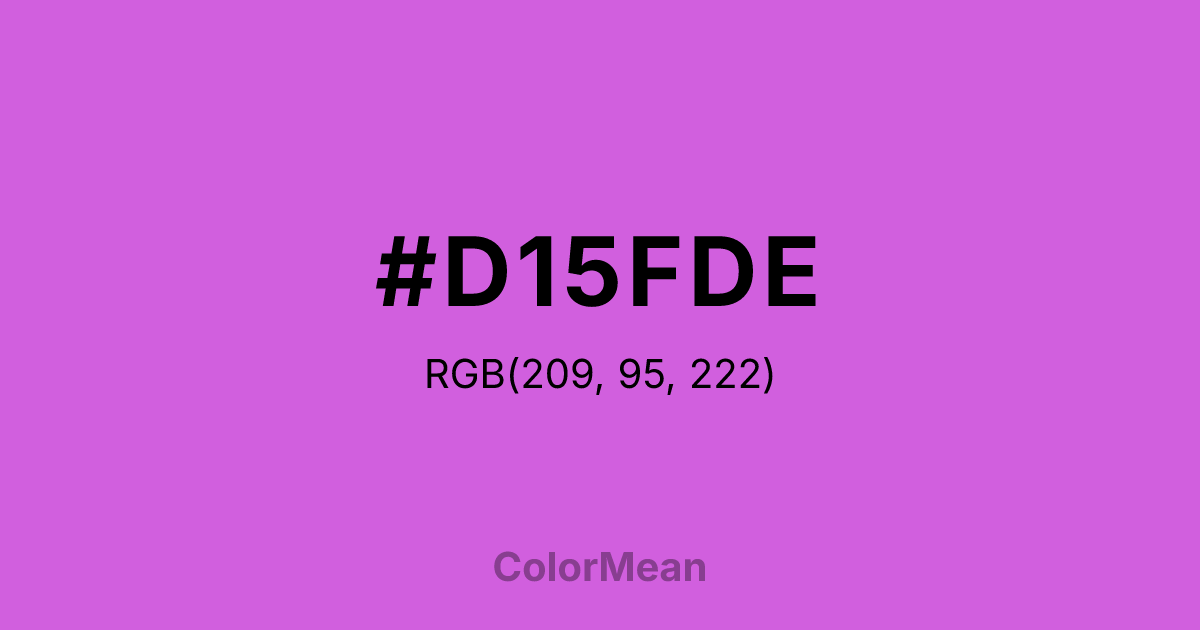 #D15FDE RGB value is (209, 95, 222). The hex color red value is 209, green is 95, and blue is 222. Its HSL format shows a hue of 294°, saturation of 66 percent, and lightness of 62 percent. The CMYK process values are 6 percent, 57 percent, 0 percent, 13 percent.