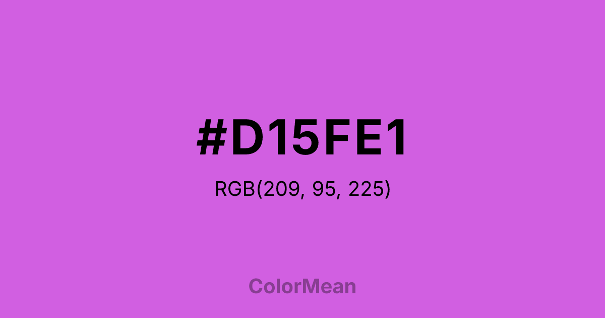 #D15FE1 RGB value is (209, 95, 225). The hex color red value is 209, green is 95, and blue is 225. Its HSL format shows a hue of 293°, saturation of 68 percent, and lightness of 63 percent. The CMYK process values are 7 percent, 58 percent, 0 percent, 12 percent.