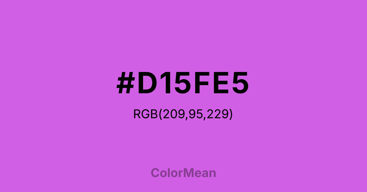 #D15FE5 RGB value is (209, 95, 229). The hex color red value is 209, green is 95, and blue is 229. Its HSL format shows a hue of 291°, saturation of 72 percent, and lightness of 64 percent. The CMYK process values are 9 percent, 59 percent, 0 percent, 10 percent.