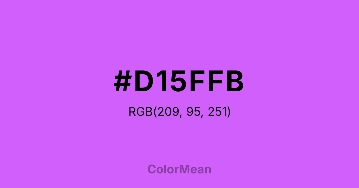 #D15FFB RGB value is (209, 95, 251). The hex color red value is 209, green is 95, and blue is 251. Its HSL format shows a hue of 284°, saturation of 95 percent, and lightness of 68 percent. The CMYK process values are 17 percent, 62 percent, 0 percent, 2 percent.