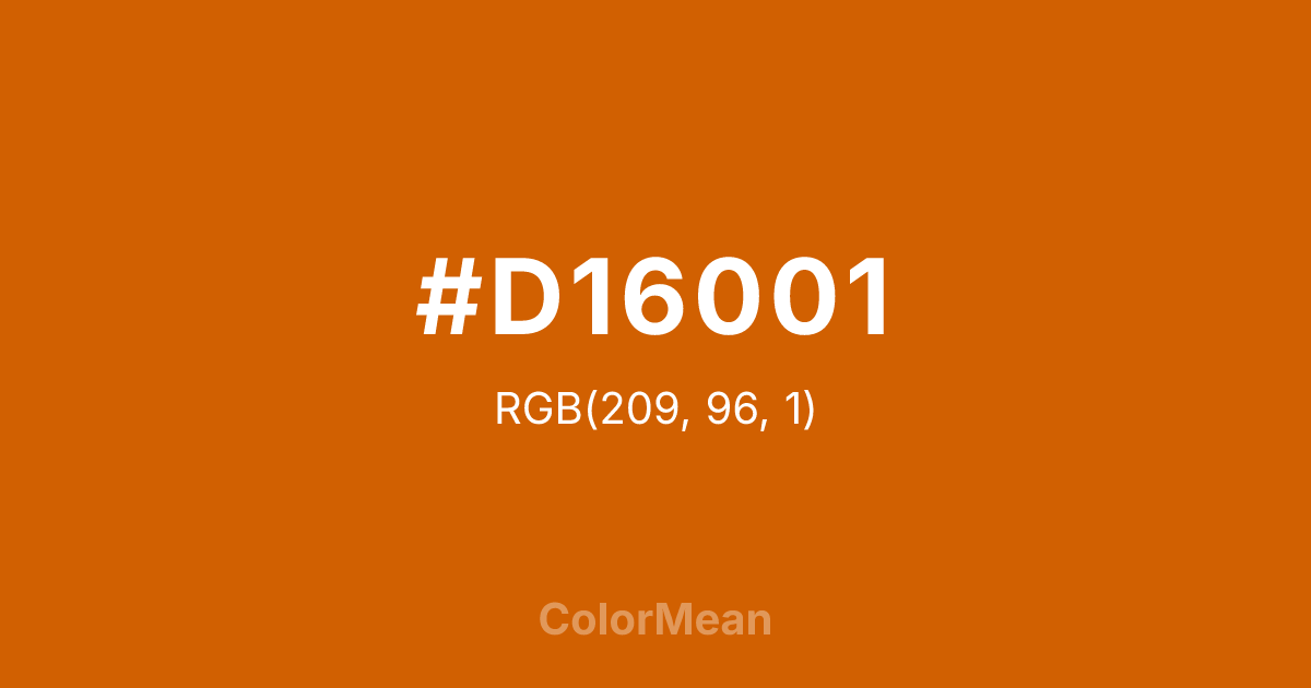 #D16001 RGB value is (209, 96, 1). The hex color red value is 209, green is 96, and blue is 1. Its HSL format shows a hue of 27°, saturation of 99 percent, and lightness of 41 percent. The CMYK process values are 0 percent, 54 percent, 100 percent, 18 percent.