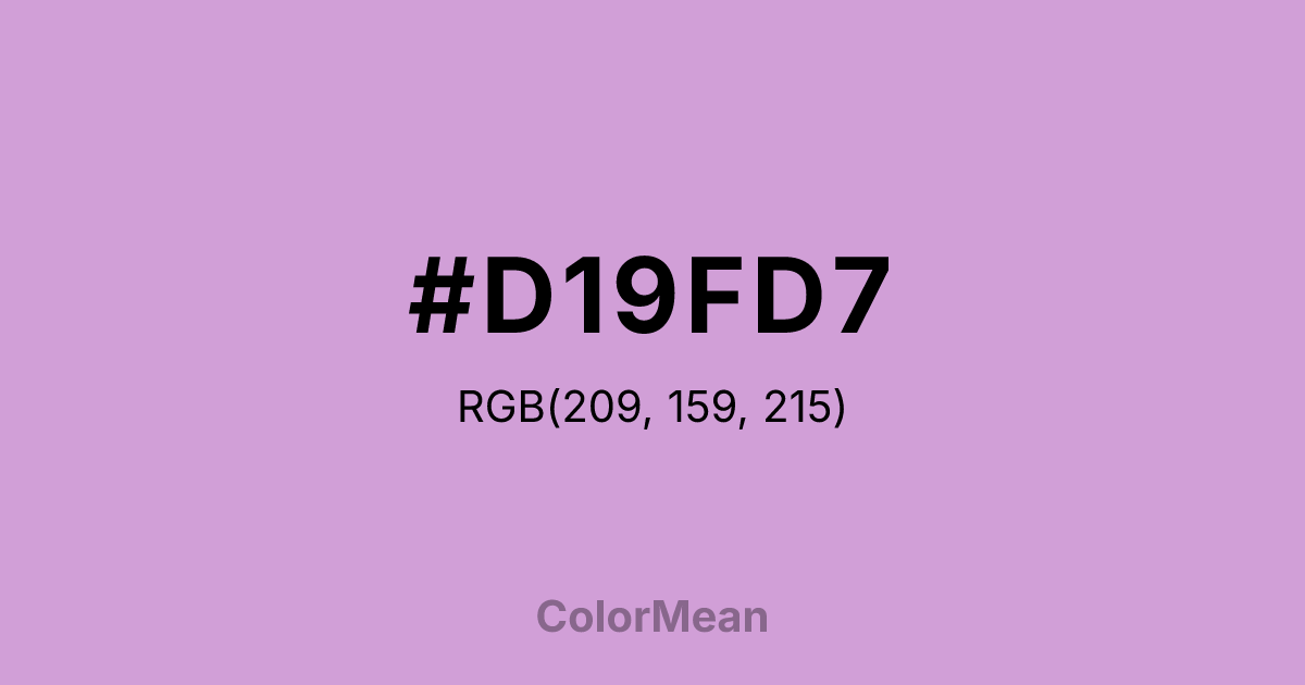 #D19FD7 RGB value is (209, 159, 215). The hex color red value is 209, green is 159, and blue is 215. Its HSL format shows a hue of 294°, saturation of 41 percent, and lightness of 73 percent. The CMYK process values are 3 percent, 26 percent, 0 percent, 16 percent.