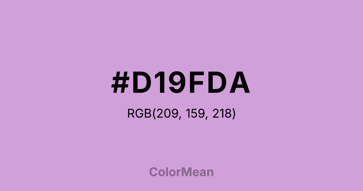 #D19FDA RGB value is (209, 159, 218). The hex color red value is 209, green is 159, and blue is 218. Its HSL format shows a hue of 291°, saturation of 44 percent, and lightness of 74 percent. The CMYK process values are 4 percent, 27 percent, 0 percent, 15 percent.