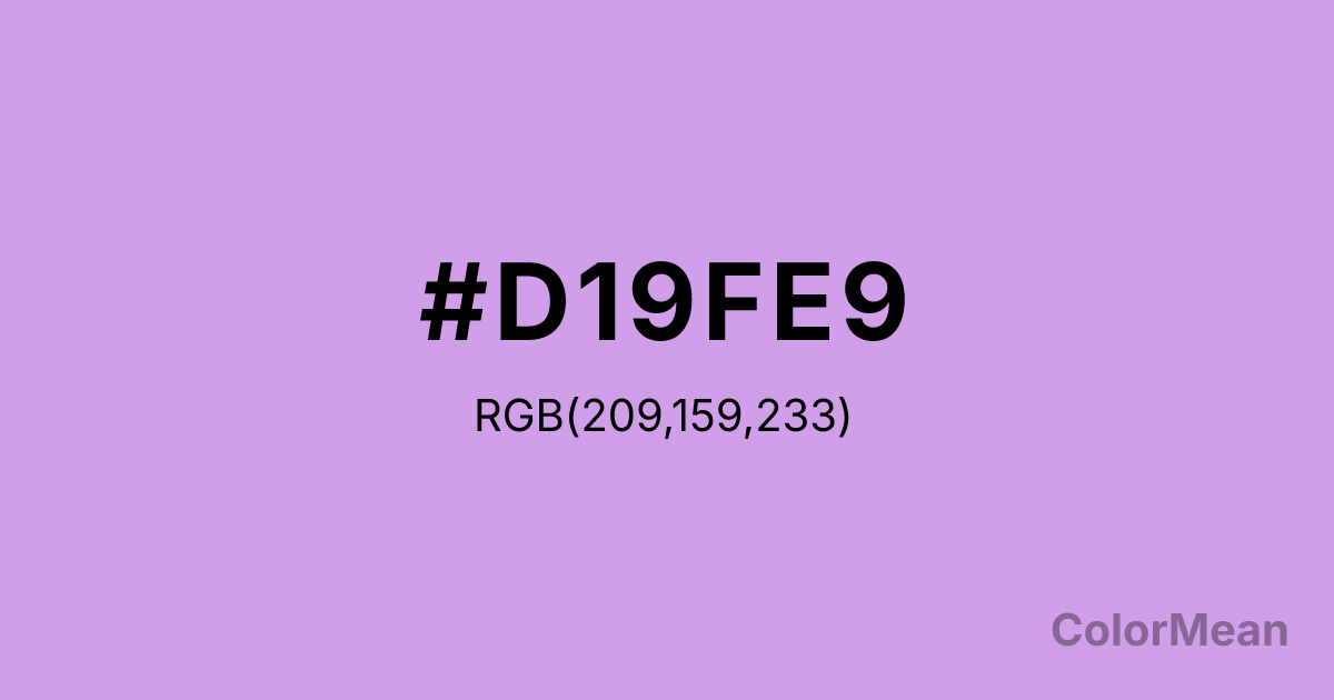 #D19FE9 RGB value is (209, 159, 233). The hex color red value is 209, green is 159, and blue is 233. Its HSL format shows a hue of 281°, saturation of 63 percent, and lightness of 77 percent. The CMYK process values are 10 percent, 32 percent, 0 percent, 9 percent.