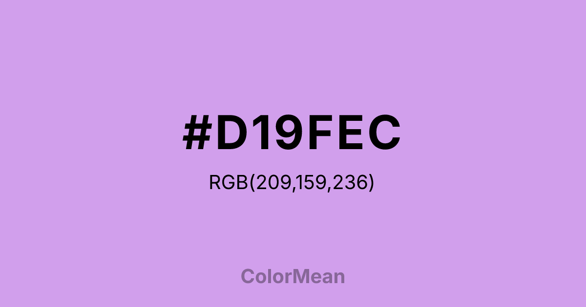 #D19FEC RGB value is (209, 159, 236). The hex color red value is 209, green is 159, and blue is 236. Its HSL format shows a hue of 279°, saturation of 67 percent, and lightness of 77 percent. The CMYK process values are 11 percent, 33 percent, 0 percent, 7 percent.