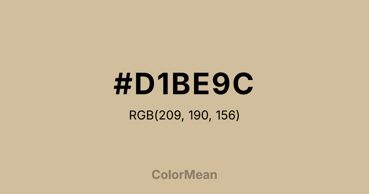 #D1BE9C RGB value is (209, 190, 156). The hex color red value is 209, green is 190, and blue is 156. Its HSL format shows a hue of 38°, saturation of 37 percent, and lightness of 72 percent. The CMYK process values are 0 percent, 9 percent, 25 percent, 18 percent.
