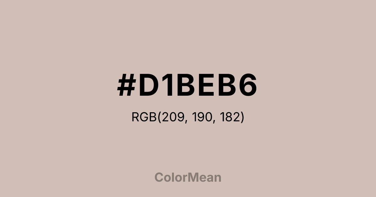 #D1BEB6 RGB value is (209, 190, 182). The hex color red value is 209, green is 190, and blue is 182. Its HSL format shows a hue of 18°, saturation of 23 percent, and lightness of 77 percent. The CMYK process values are 0 percent, 9 percent, 13 percent, 18 percent.