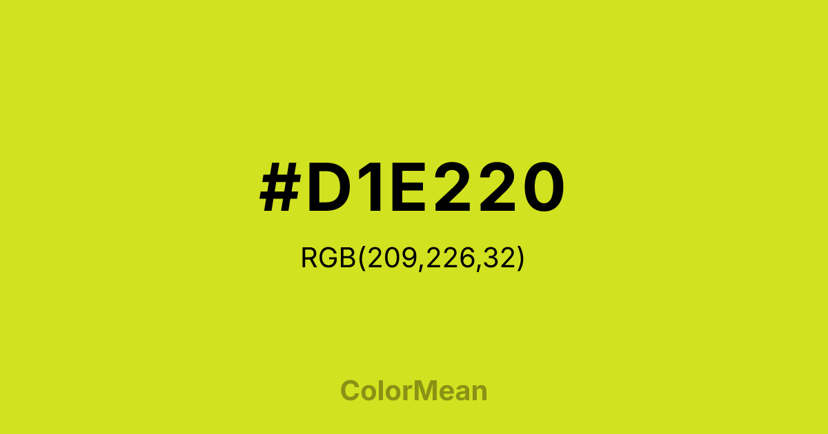 #D1E220 RGB value is (209, 226, 32). The hex color red value is 209, green is 226, and blue is 32. Its HSL format shows a hue of 65°, saturation of 77 percent, and lightness of 51 percent. The CMYK process values are 8 percent, 0 percent, 86 percent, 11 percent.