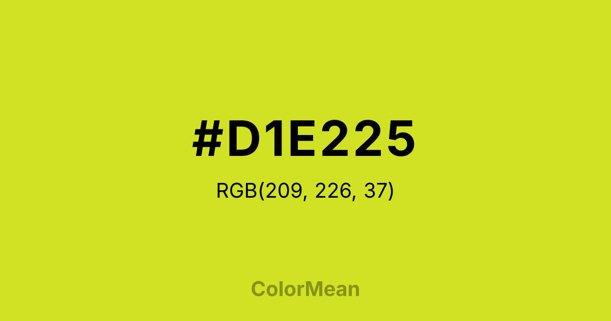 #D1E225 RGB value is (209, 226, 37). The hex color red value is 209, green is 226, and blue is 37. Its HSL format shows a hue of 65°, saturation of 77 percent, and lightness of 52 percent. The CMYK process values are 8 percent, 0 percent, 84 percent, 11 percent.