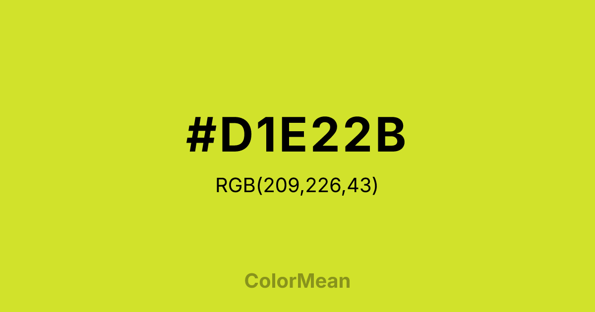 #D1E22B RGB value is (209, 226, 43). The hex color red value is 209, green is 226, and blue is 43. Its HSL format shows a hue of 66°, saturation of 76 percent, and lightness of 53 percent. The CMYK process values are 8 percent, 0 percent, 81 percent, 11 percent.