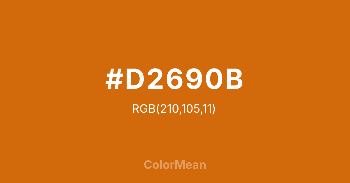 #D2690B RGB value is (210, 105, 11). The hex color red value is 210, green is 105, and blue is 11. Its HSL format shows a hue of 28°, saturation of 90 percent, and lightness of 43 percent. The CMYK process values are 0 percent, 50 percent, 95 percent, 18 percent.