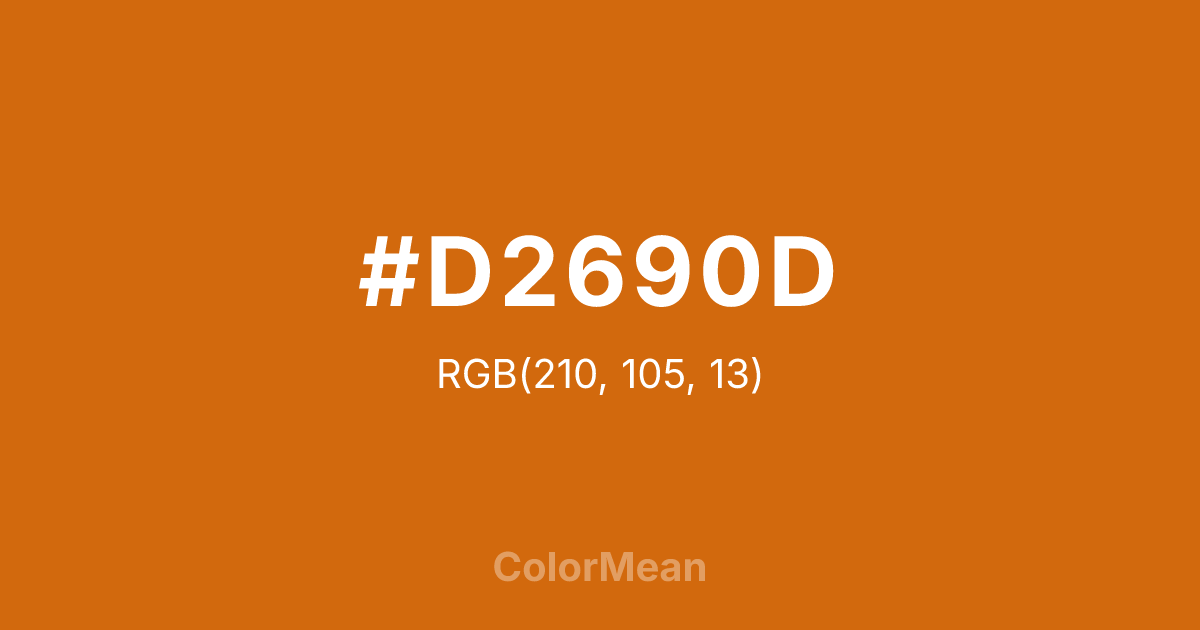 #D2690D RGB value is (210, 105, 13). The hex color red value is 210, green is 105, and blue is 13. Its HSL format shows a hue of 28°, saturation of 88 percent, and lightness of 44 percent. The CMYK process values are 0 percent, 50 percent, 94 percent, 18 percent.