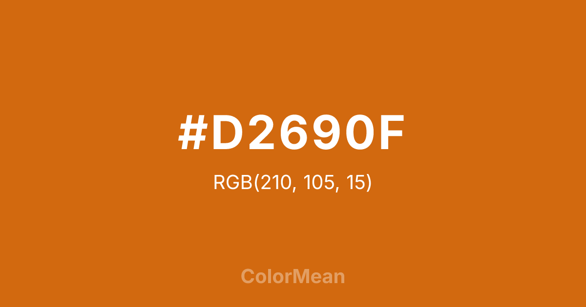 #D2690F RGB value is (210, 105, 15). The hex color red value is 210, green is 105, and blue is 15. Its HSL format shows a hue of 28°, saturation of 87 percent, and lightness of 44 percent. The CMYK process values are 0 percent, 50 percent, 93 percent, 18 percent.