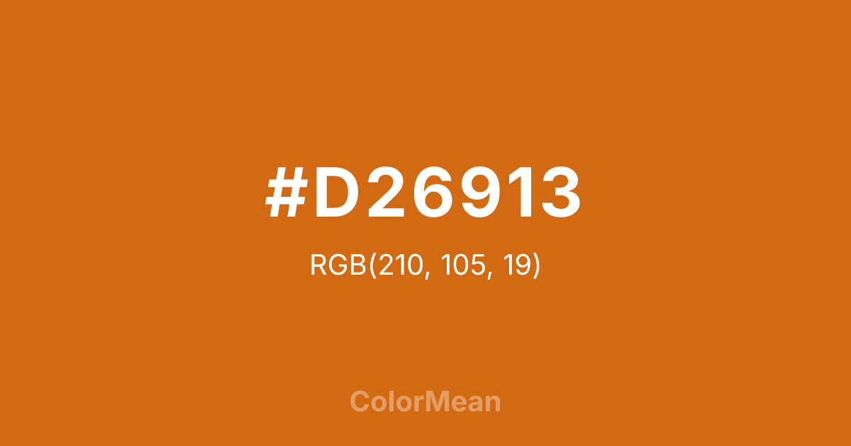 #D26913 RGB value is (210, 105, 19). The hex color red value is 210, green is 105, and blue is 19. Its HSL format shows a hue of 27°, saturation of 83 percent, and lightness of 45 percent. The CMYK process values are 0 percent, 50 percent, 91 percent, 18 percent.