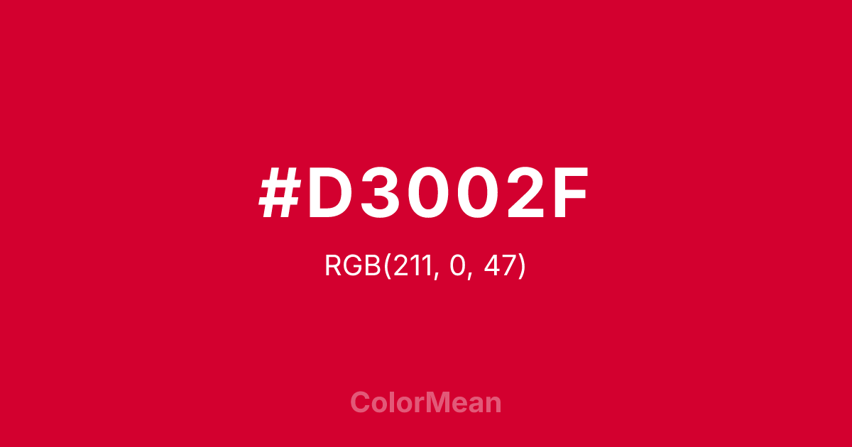 #D3002F RGB value is (211, 0, 47). The hex color red value is 211, green is 0, and blue is 47. Its HSL format shows a hue of 347°, saturation of 100 percent, and lightness of 41 percent. The CMYK process values are 0 percent, 100 percent, 78 percent, 17 percent.