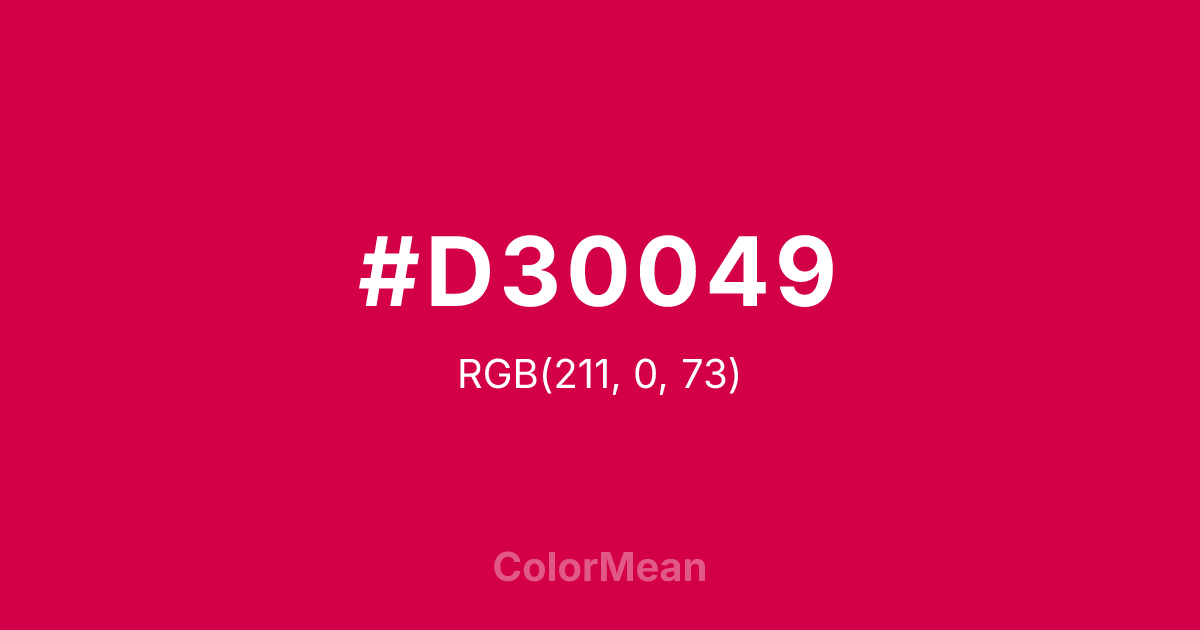 #D30049 RGB value is (211, 0, 73). The hex color red value is 211, green is 0, and blue is 73. Its HSL format shows a hue of 339°, saturation of 100 percent, and lightness of 41 percent. The CMYK process values are 0 percent, 100 percent, 65 percent, 17 percent.