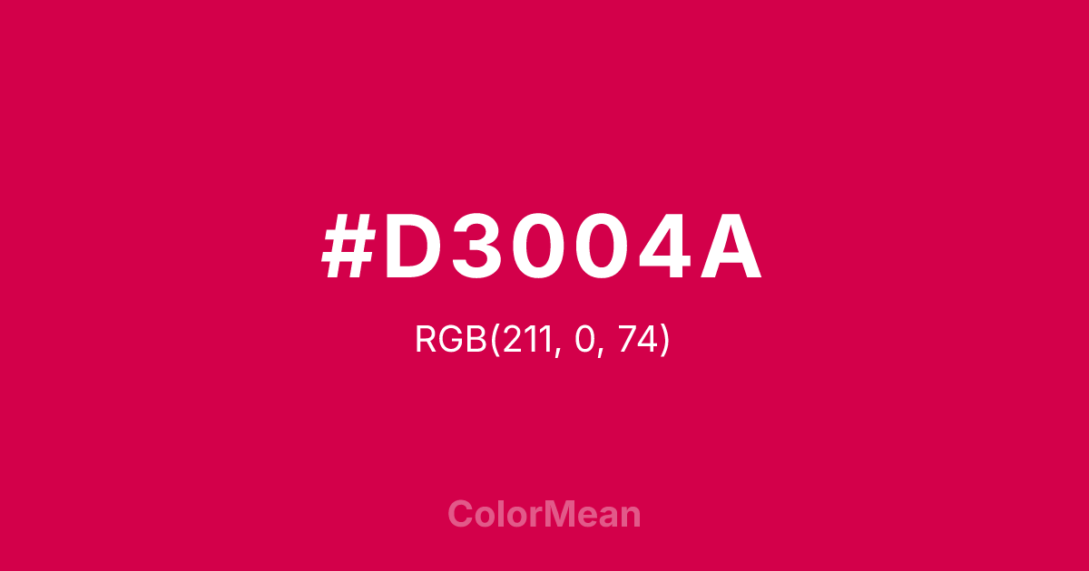 #D3004A RGB value is (211, 0, 74). The hex color red value is 211, green is 0, and blue is 74. Its HSL format shows a hue of 339°, saturation of 100 percent, and lightness of 41 percent. The CMYK process values are 0 percent, 100 percent, 65 percent, 17 percent.
