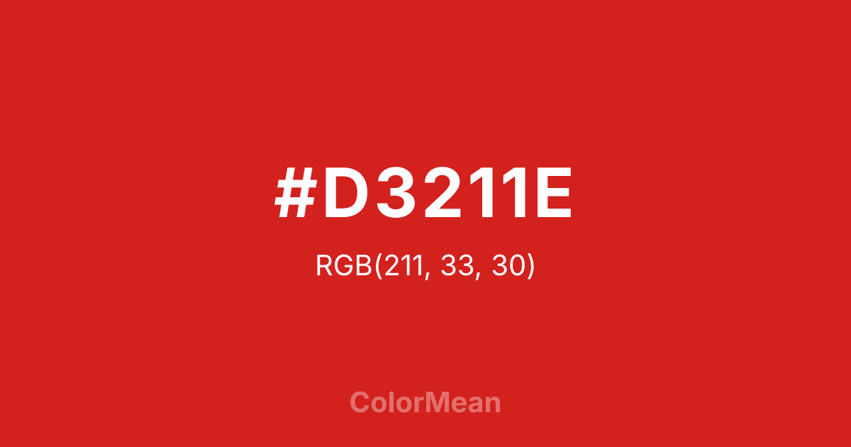 #D3211E RGB value is (211, 33, 30). The hex color red value is 211, green is 33, and blue is 30. Its HSL format shows a hue of 1°, saturation of 75 percent, and lightness of 47 percent. The CMYK process values are 0 percent, 84 percent, 86 percent, 17 percent.