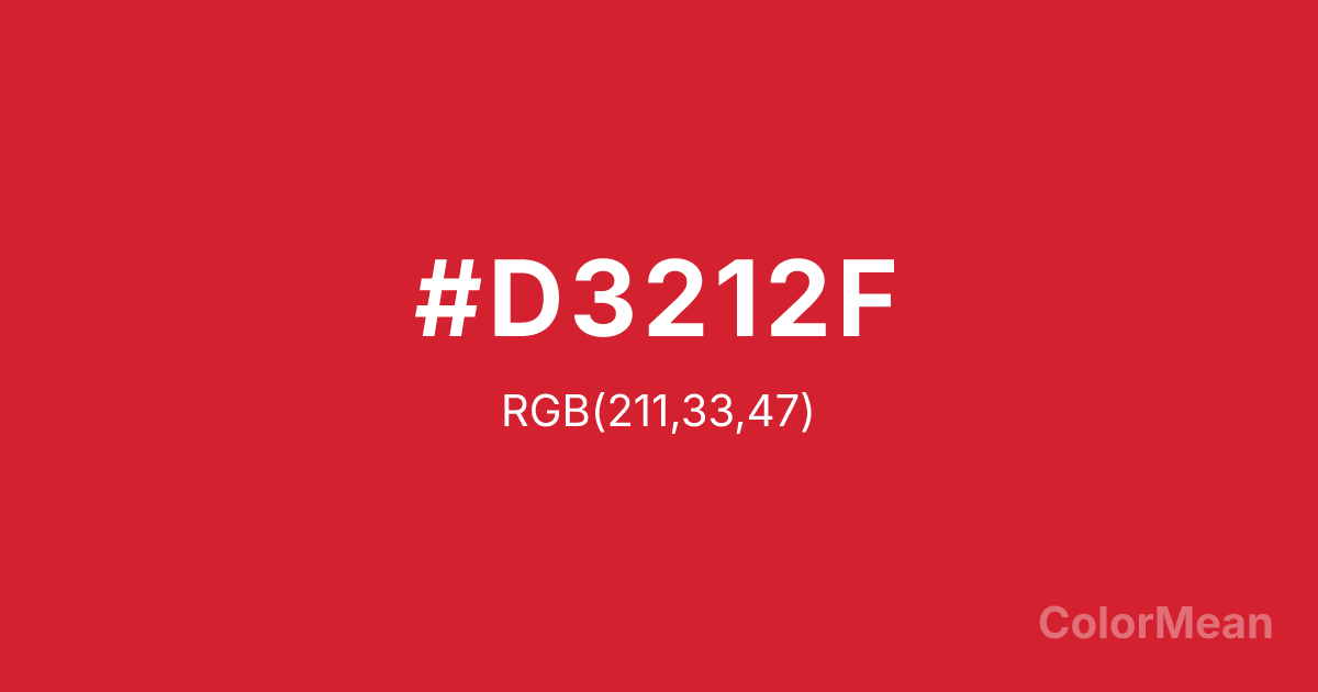 #D3212F RGB value is (211, 33, 47). The hex color red value is 211, green is 33, and blue is 47. Its HSL format shows a hue of 355°, saturation of 73 percent, and lightness of 48 percent. The CMYK process values are 0 percent, 84 percent, 78 percent, 17 percent.
