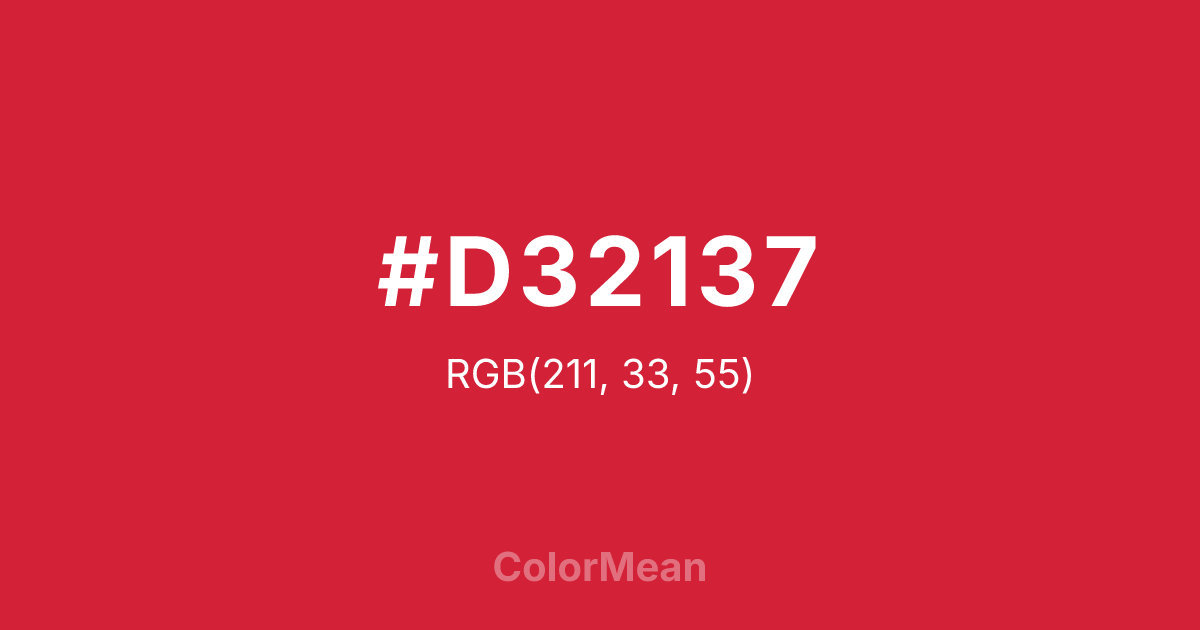 #D32137 RGB value is (211, 33, 55). The hex color red value is 211, green is 33, and blue is 55. Its HSL format shows a hue of 353°, saturation of 73 percent, and lightness of 48 percent. The CMYK process values are 0 percent, 84 percent, 74 percent, 17 percent.