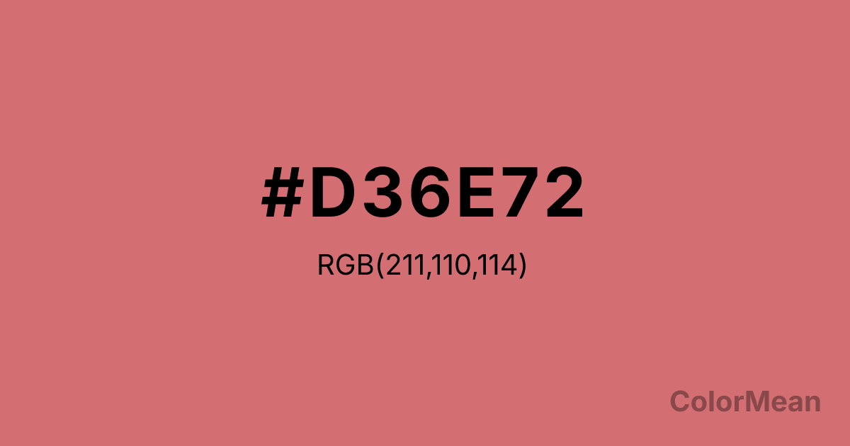 #D36E72 RGB value is (211, 110, 114). The hex color red value is 211, green is 110, and blue is 114. Its HSL format shows a hue of 358°, saturation of 53 percent, and lightness of 63 percent. The CMYK process values are 0 percent, 48 percent, 46 percent, 17 percent.