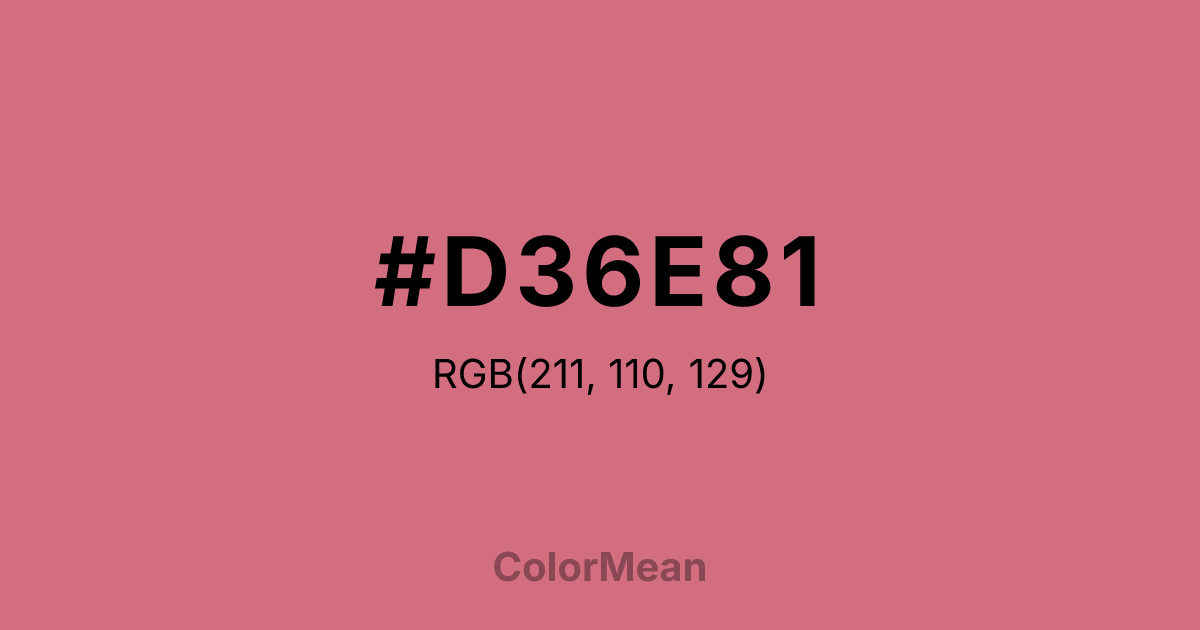 #D36E81 RGB value is (211, 110, 129). The hex color red value is 211, green is 110, and blue is 129. Its HSL format shows a hue of 349°, saturation of 53 percent, and lightness of 63 percent. The CMYK process values are 0 percent, 48 percent, 39 percent, 17 percent.