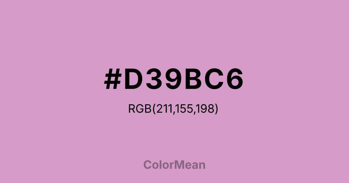 #D39BC6 RGB value is (211, 155, 198). The hex color red value is 211, green is 155, and blue is 198. Its HSL format shows a hue of 314°, saturation of 39 percent, and lightness of 72 percent. The CMYK process values are 0 percent, 27 percent, 6 percent, 17 percent.