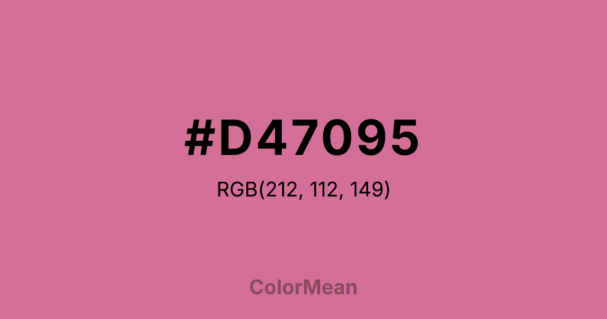 #D47095 RGB value is (212, 112, 149). The hex color red value is 212, green is 112, and blue is 149. Its HSL format shows a hue of 338°, saturation of 54 percent, and lightness of 64 percent. The CMYK process values are 0 percent, 47 percent, 30 percent, 17 percent.