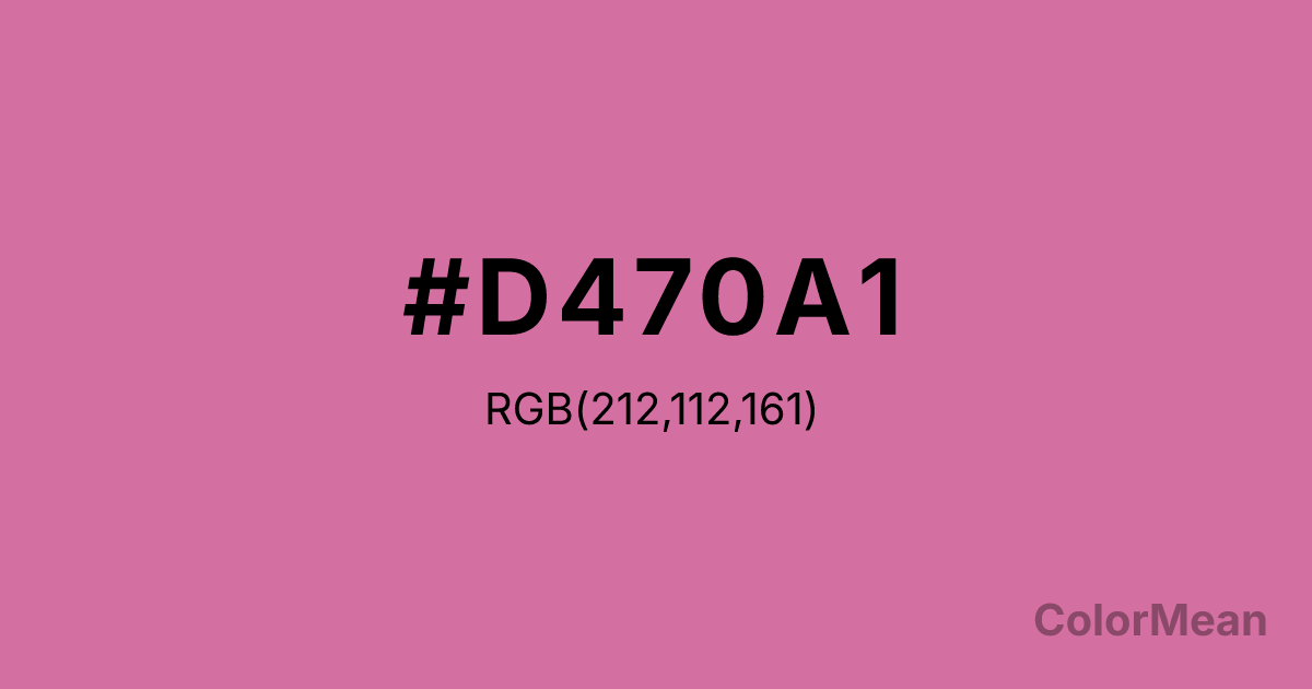 #D470A1 RGB value is (212, 112, 161). The hex color red value is 212, green is 112, and blue is 161. Its HSL format shows a hue of 331°, saturation of 54 percent, and lightness of 64 percent. The CMYK process values are 0 percent, 47 percent, 24 percent, 17 percent.