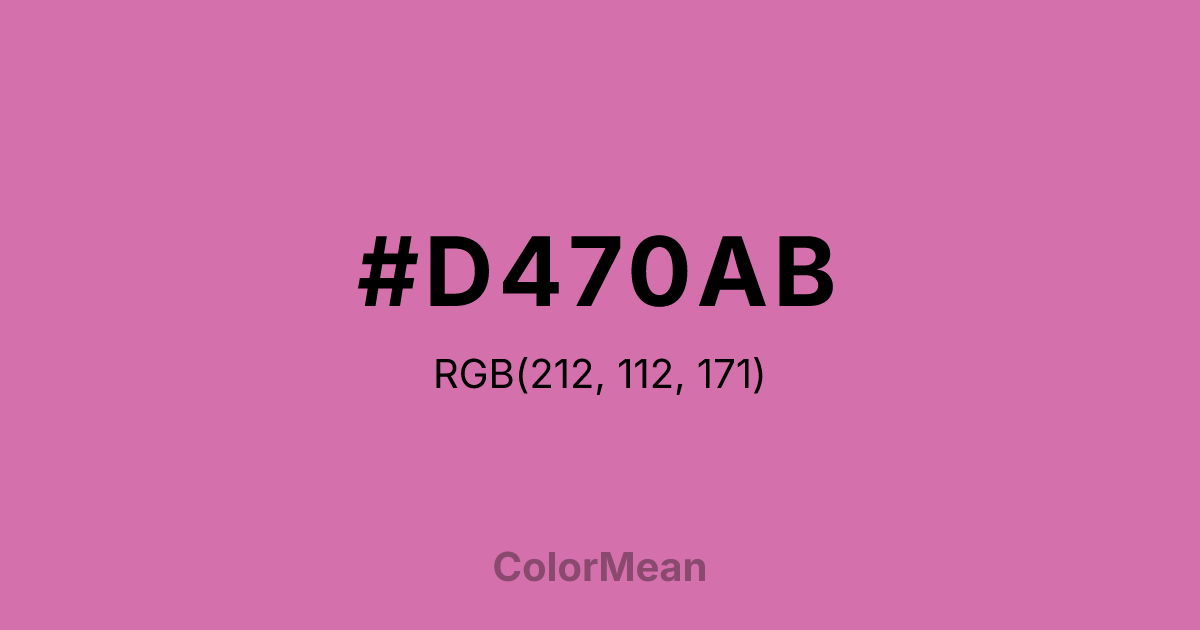 #D470AB RGB value is (212, 112, 171). The hex color red value is 212, green is 112, and blue is 171. Its HSL format shows a hue of 325°, saturation of 54 percent, and lightness of 64 percent. The CMYK process values are 0 percent, 47 percent, 19 percent, 17 percent.