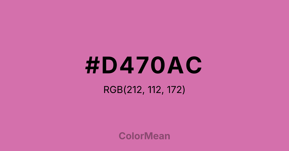 #D470AC RGB value is (212, 112, 172). The hex color red value is 212, green is 112, and blue is 172. Its HSL format shows a hue of 324°, saturation of 54 percent, and lightness of 64 percent. The CMYK process values are 0 percent, 47 percent, 19 percent, 17 percent.