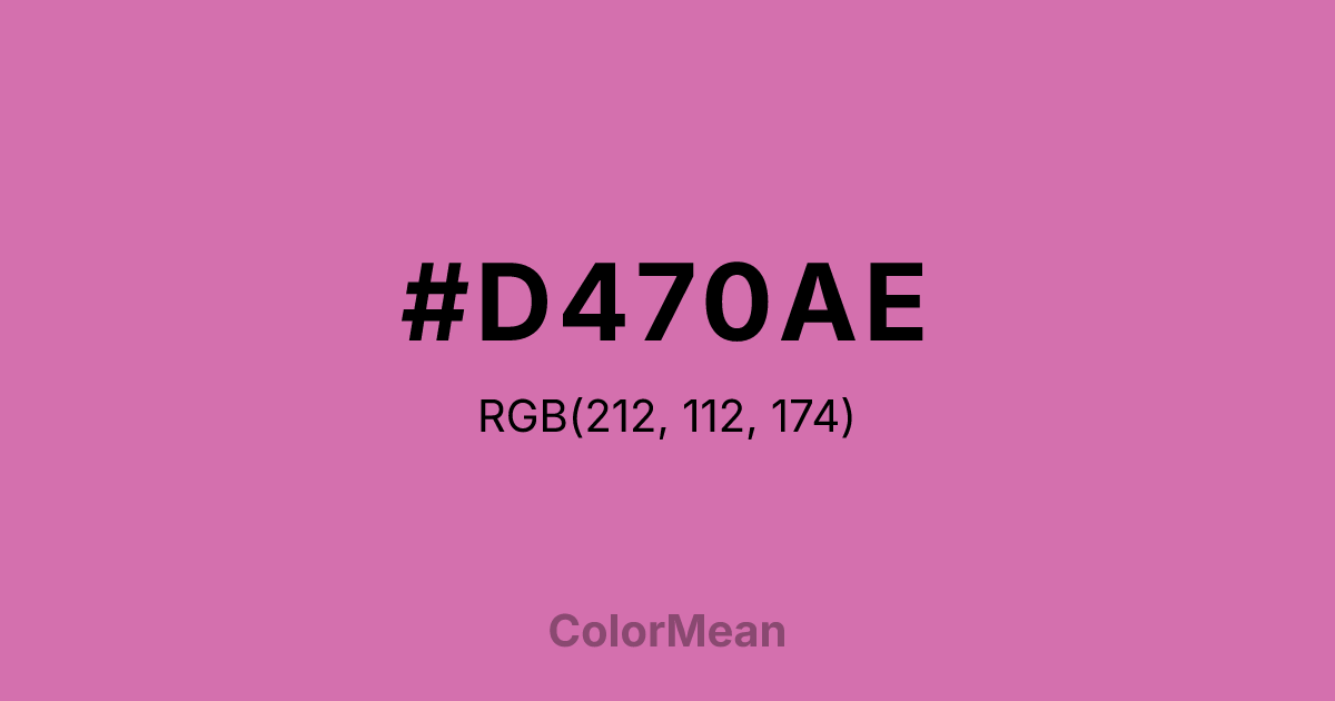 #D470AE RGB value is (212, 112, 174). The hex color red value is 212, green is 112, and blue is 174. Its HSL format shows a hue of 323°, saturation of 54 percent, and lightness of 64 percent. The CMYK process values are 0 percent, 47 percent, 18 percent, 17 percent.