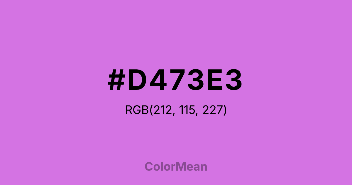 #D473E3 RGB value is (212, 115, 227). The hex color red value is 212, green is 115, and blue is 227. Its HSL format shows a hue of 292°, saturation of 67 percent, and lightness of 67 percent. The CMYK process values are 7 percent, 49 percent, 0 percent, 11 percent.