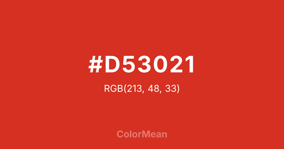 #D53021 RGB value is (213, 48, 33). The hex color red value is 213, green is 48, and blue is 33. Its HSL format shows a hue of 5°, saturation of 73 percent, and lightness of 48 percent. The CMYK process values are 0 percent, 77 percent, 85 percent, 16 percent.
