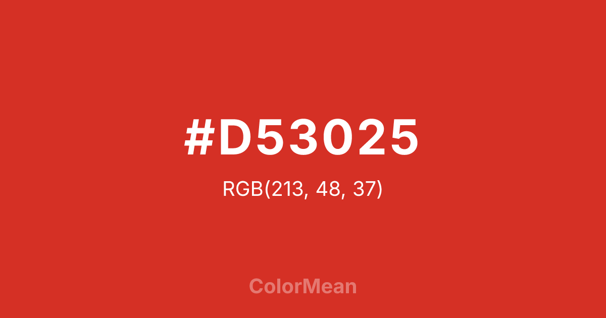 #D53025 RGB value is (213, 48, 37). The hex color red value is 213, green is 48, and blue is 37. Its HSL format shows a hue of 4°, saturation of 70 percent, and lightness of 49 percent. The CMYK process values are 0 percent, 77 percent, 83 percent, 16 percent.