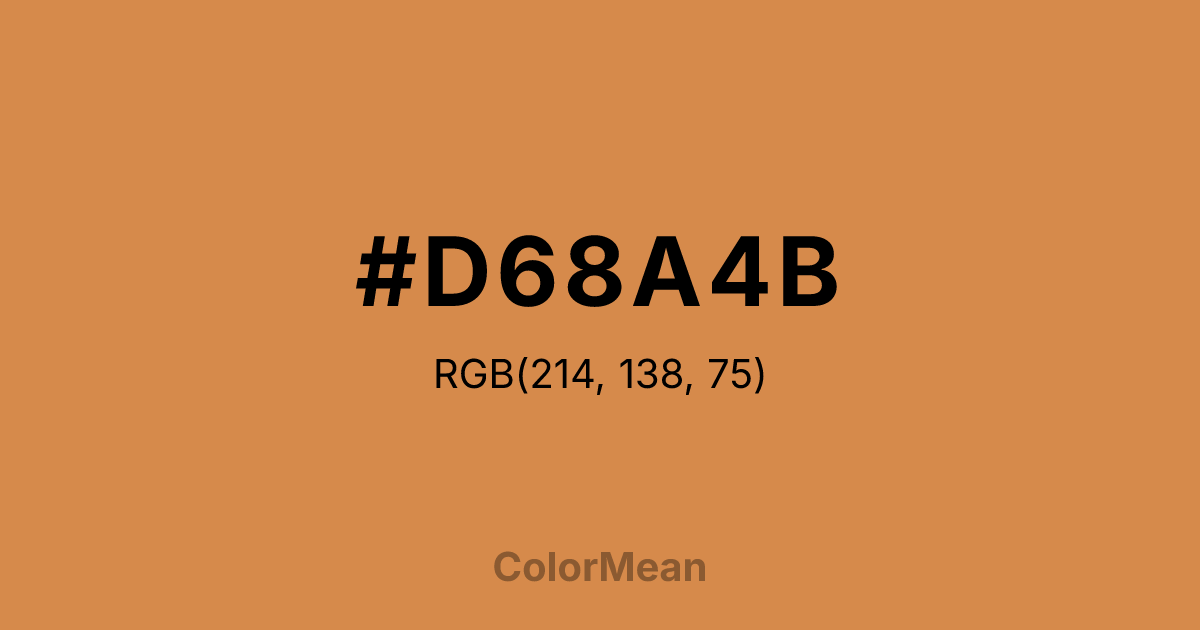 #D68A4B RGB value is (214, 138, 75). The hex color red value is 214, green is 138, and blue is 75. Its HSL format shows a hue of 27°, saturation of 63 percent, and lightness of 57 percent. The CMYK process values are 0 percent, 36 percent, 65 percent, 16 percent.