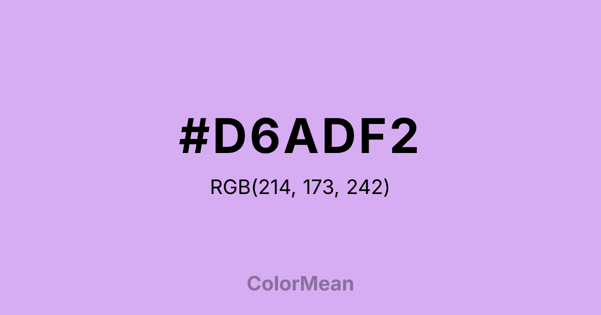 #D6ADF2 RGB value is (214, 173, 242). The hex color red value is 214, green is 173, and blue is 242. Its HSL format shows a hue of 276°, saturation of 73 percent, and lightness of 81 percent. The CMYK process values are 12 percent, 29 percent, 0 percent, 5 percent.