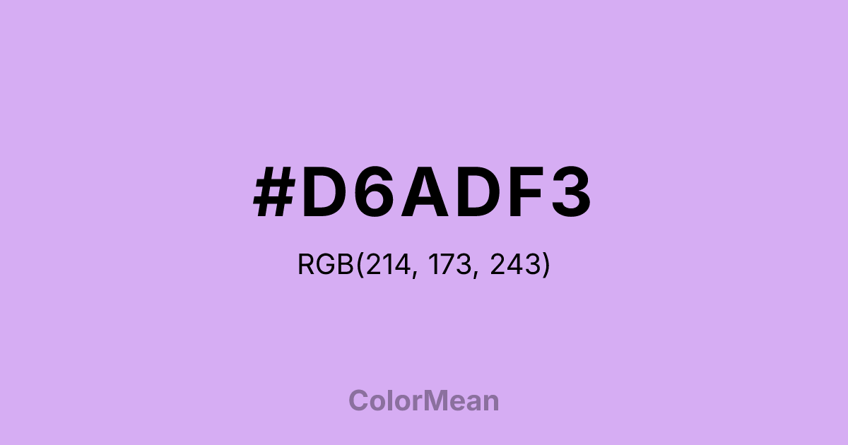 #D6ADF3 RGB value is (214, 173, 243). The hex color red value is 214, green is 173, and blue is 243. Its HSL format shows a hue of 275°, saturation of 74 percent, and lightness of 82 percent. The CMYK process values are 12 percent, 29 percent, 0 percent, 5 percent.