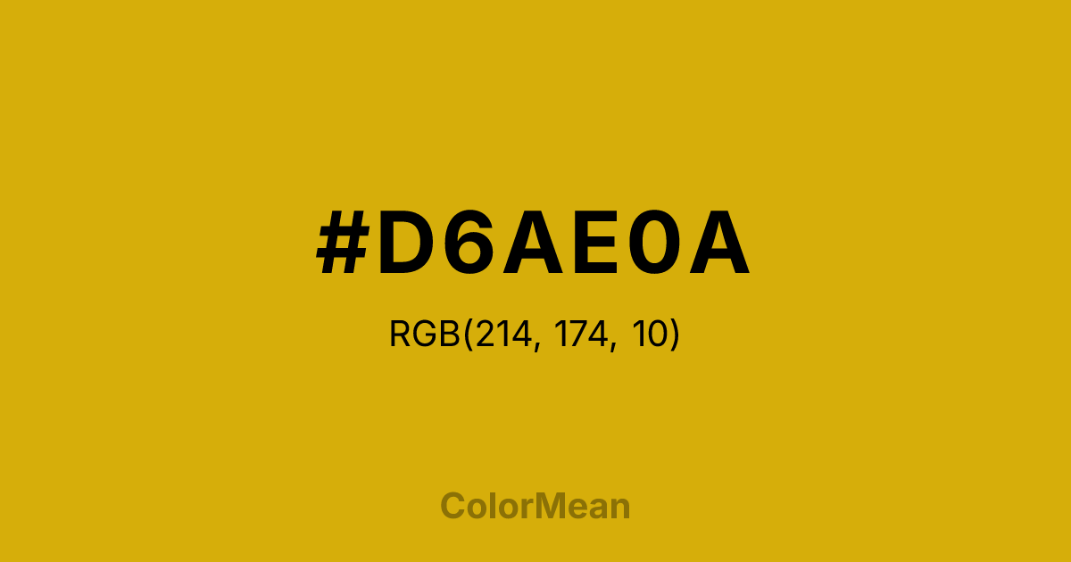 #D6AE0A RGB value is (214, 174, 10). The hex color red value is 214, green is 174, and blue is 10. Its HSL format shows a hue of 48°, saturation of 91 percent, and lightness of 44 percent. The CMYK process values are 0 percent, 19 percent, 95 percent, 16 percent.