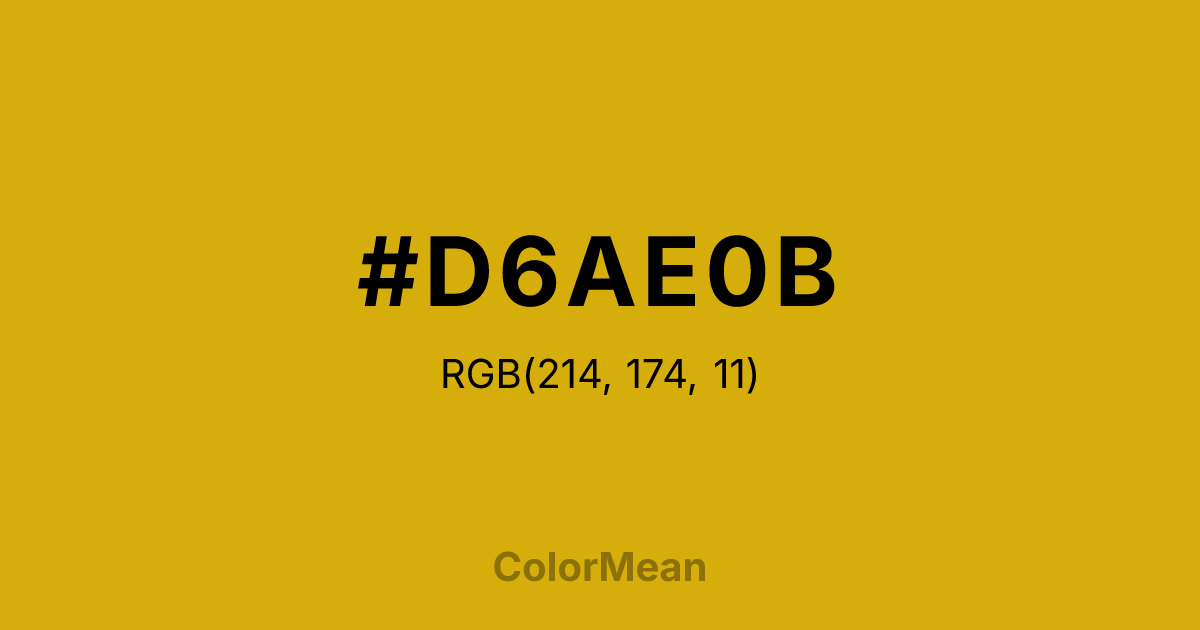#D6AE0B RGB value is (214, 174, 11). The hex color red value is 214, green is 174, and blue is 11. Its HSL format shows a hue of 48°, saturation of 90 percent, and lightness of 44 percent. The CMYK process values are 0 percent, 19 percent, 95 percent, 16 percent.