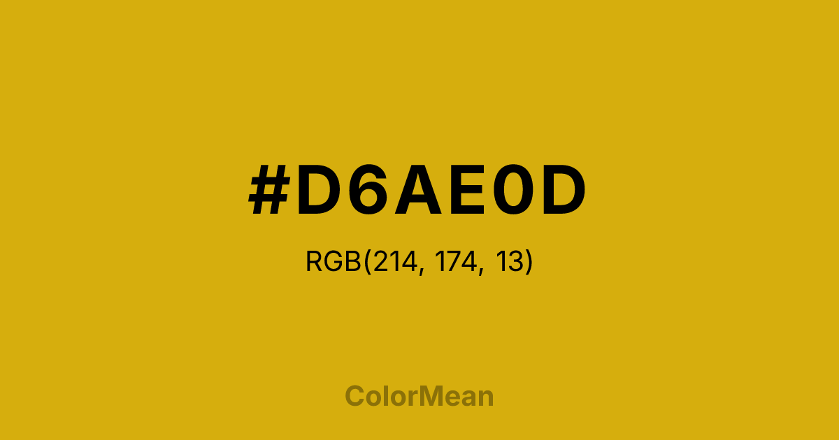 #D6AE0D RGB value is (214, 174, 13). The hex color red value is 214, green is 174, and blue is 13. Its HSL format shows a hue of 48°, saturation of 89 percent, and lightness of 45 percent. The CMYK process values are 0 percent, 19 percent, 94 percent, 16 percent.