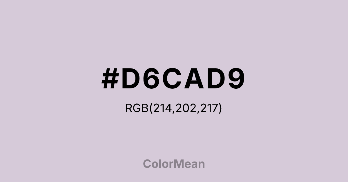#D6CAD9 RGB value is (214, 202, 217). The hex color red value is 214, green is 202, and blue is 217. Its HSL format shows a hue of 288°, saturation of 16 percent, and lightness of 82 percent. The CMYK process values are 1 percent, 7 percent, 0 percent, 15 percent.